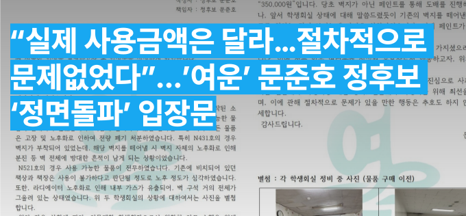 문준호 정후보 “실제 사용 금액은 책상 14만 원, 벽지 35만 원…심각한 학생회실 상태 때문” “진실된 후보자로 행동하고자 사실관계 밝혀…물의를 블러일으킨 데에는 진심으로 사과드린다”