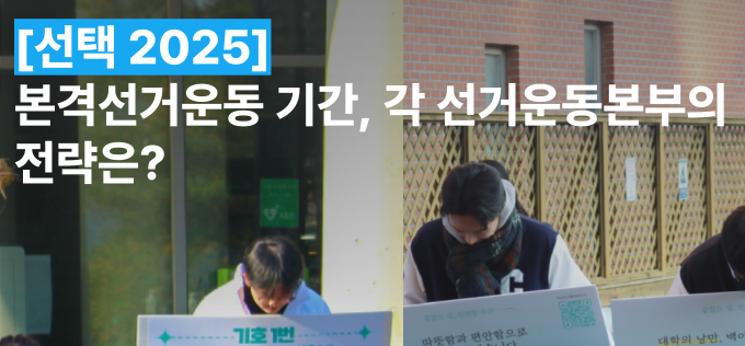 여운과 백야 모두 거리 유세 강화…공약자료집 QR과 인스타그램 페이지 개설 돋보여 교육 공약 1번은 여운 “학점 비율 조정 논의 및 추진” VS 백야 “공결 인정 범위 확대”