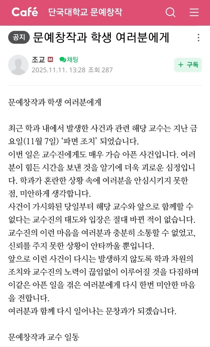지난 11일, 단국대 문예창작과 네이버 카페에는 ‘문예창작과 학생 여러분에게’라는 제목의 공지글이 게시됐다. 공지에 따르면 A 교수는 징계위원회 심의 결과, 11월 7일 자로 파면 조치가 결정됐다.