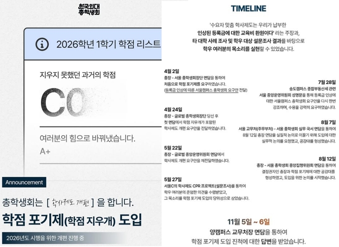 12일 한국외대 서울캠퍼스 총학생회 ‘박동’에 따르면 교무처는 2026년 1학기 학점포기제 도입을 목표로 개편을 진행 중이다. 서울·글로벌캠퍼스 총학생회는 당선 이래 지속적으로 학점포기제를 요구했고, 최근 교무처와의 면담을 통해 도입 진척에 대해 답변받았다. ‘박동’은 앞서 지난해 11월 학점포기제 도입을 공약으로 내걸어 당선된 바 있다.