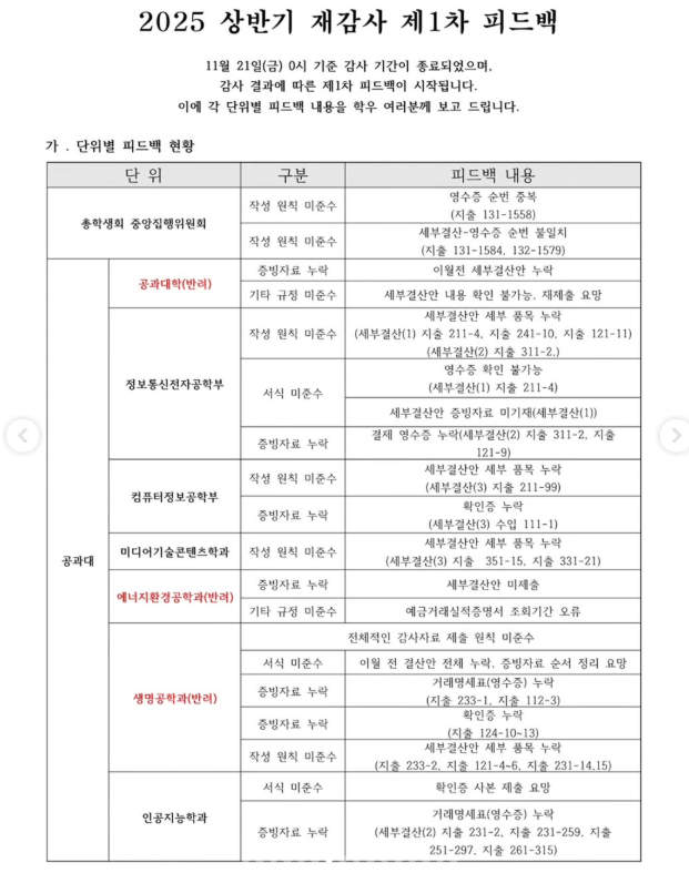 한편 이번에 발표된 예산감사 결과는 전체 단위 중 무려 19개 단위가 ‘반려’ 조치를 당했다. 일부 단위는 ‘세부결산안 내용 확인 불가능’이나 ‘누락’이라는 결과가 발표됐다. 특히 이번에 발표된 단위 중 박찬 위원장이 현재 공과대학 회장으로 있는 공과대학이 ‘세부결산안 내용 확인 불가능’이라는 감사 내용이 발표되며 논란은 더 가속할 예정이다.