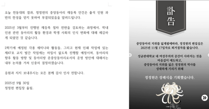 성균관대 여성주의 교지 정정헌도 ‘활동 인원 미비’를 이유로 중앙동아리에서 강등됐다. 정정헌은 이후 활동 인원 명부 등 추가 자료를 제출했으나, 성균관대 동아리연합회는 “사진상 활동 인원이 부족해 보인다”는 이유를 들며 준강등 처분을 유지했다.