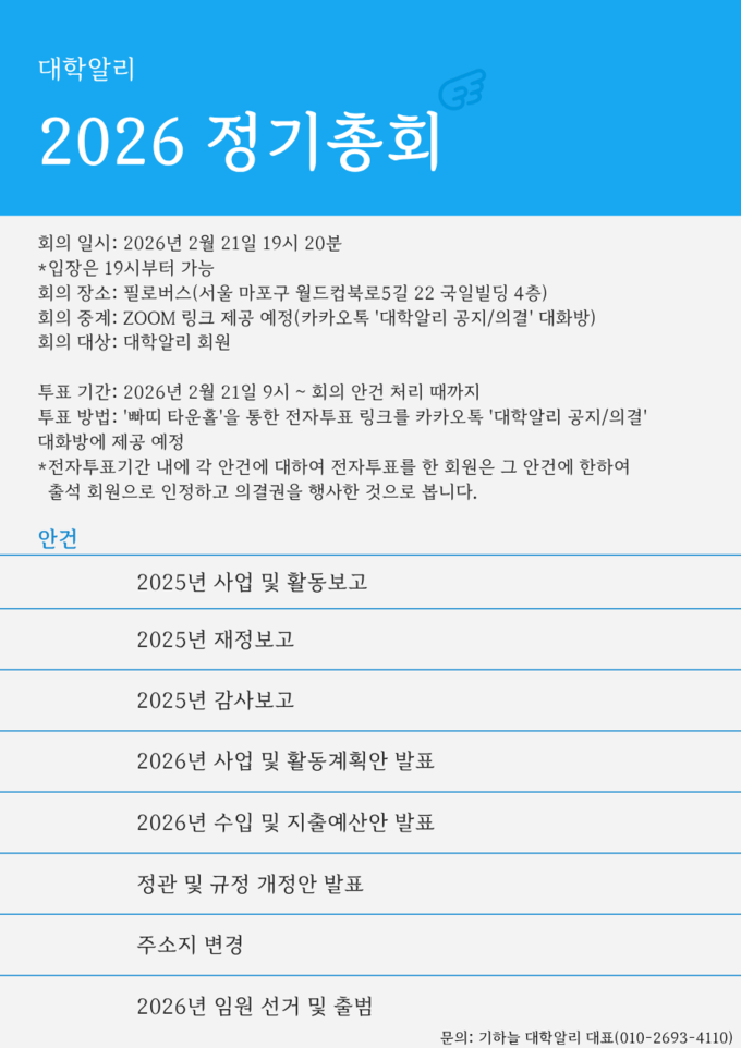 대학알리 2026년 정기총회를 다음과 같이 공고합니다.