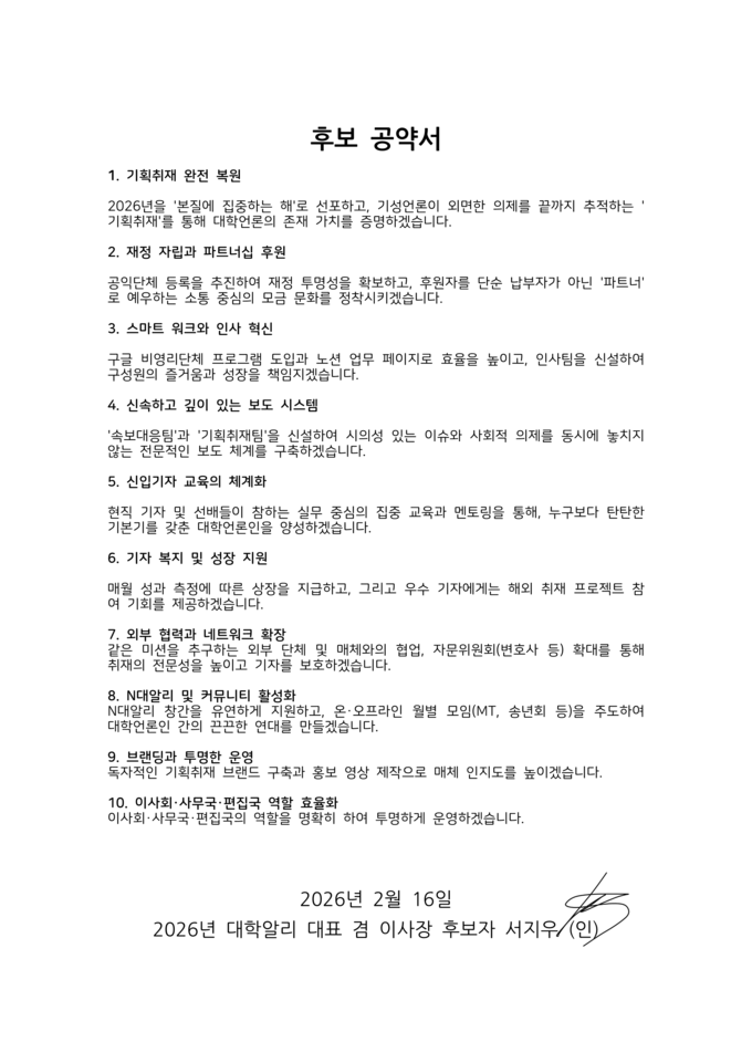「대학알리 정관」, 「대학알리 선거에 관한 규정」에 근거하여 2026년 대학알리 정기 임원 선거에 대학알리 대표 겸 이사장으로 아래 후보가 단일후보로 입후보하였음을 공고합니다.
