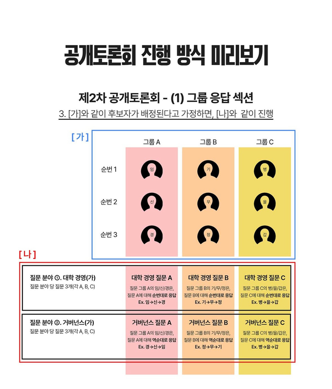 두 번째 세션인 그룹 토론 세션은 각 후보자가 자신과 다른 두 그룹에 속해 있는 후보자를 각 한 명씩 지목하여 질의하는 방식으로 진행됐다.