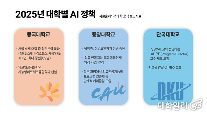 많은 대학이 ‘AI 인재 확보’를 외치며 경쟁적으로 교육 정책을 펼치고 있다. 동국대학교는 첨단분야 학과를 서울 소재 대학 중에서 가장 많이 증원하면서(89명) AI 중심 학과인 ‘의료인공지능공학과’와 ‘지능형네트워크융합학과’를 신설했다. 중앙대학교도 AI 학과와 산업보안학과의 정원을 늘리면서 의료 AI 인재를 확보하기 위해 점진적인 시스템 구축에 나섰다. 단국대학교는 ‘AI 캠퍼스’ 조성을 위해 단과대별 ‘AI-PD(Program Director)교수’를 배치했다.