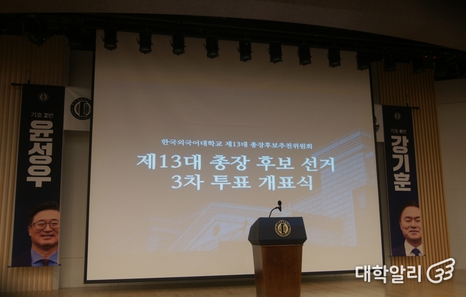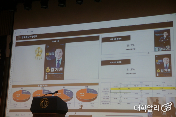 28일 오전 10시부터 오후 7시까지 진행된 한국외국어대학교(이하 한국외대) 제13대 총장 후보 선거 3차 결선 투표에서 강기훈 후보가 가중 득표율 71.3%로 1위를 차지했다. 이번 3차 결선 투표의 전체 투표율은 56.84%, 학생 투표율은 58.18%였다.