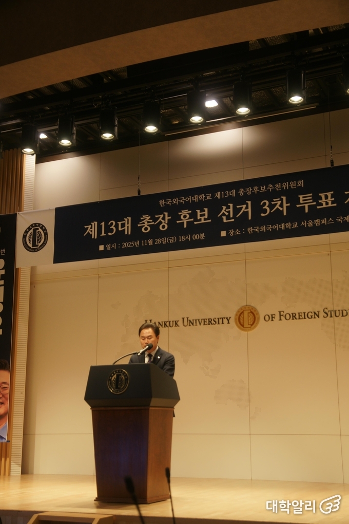 이어 최종 총장 후보로 당선된 강기훈 후보는 “영광스러운 이 자리에 설 수 있게 되어 감사드린다. 모든 절차와 제도를 존중하며, 결선까지 함께 완주해주신 윤성우 후보님을 비롯한 모든 후보님들께 존경과 감사의 마음을 전한다”고 했다. 또 "앞으로 모든 구성원의 목소리를 듣고 품어내는 리더가 되어 외대를 더 자랑스럽게 만들겠다"고 최종 총장 후보로 선정된 소감을 전했다.
