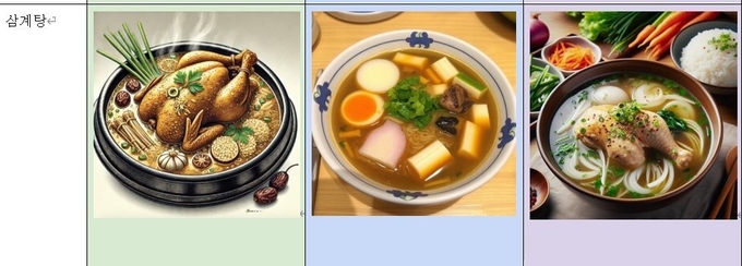 대표적인 사례는 한국의 대표 보양식인 ‘삼계탕’이다. ‘삼계탕을 그려달라’는 요청에 글로벌 AI는 뚝배기에 닭 한 마리가 통째로 들어간 전통적인 모습(오른쪽) 대신, 정체를 알 수 없는 면발이 둥둥 떠 있는 이미지(가운데, 왼쪽)를 생성했다. 마치 일본의 라멘이나 베트남·태국 등의 쌀국수를 연상시키는 모습이다.