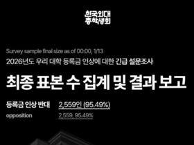 한국외국어대학교(이하 한국외대)는 지난 7일 2026학년도 학부⋅대학원 등록금을 3.19% 인상하는 방안을 추진한다고 공식 발표했다. 지난해 등록금을 5% 인상한 데 이어 불과 1년도 채 지나지 않은 시점에서 또다시 등록금 인상을 추진하는 것이다. 학교 측은 현재 불안정한 재정 여건을 이유로 등록금 인상이 불가피하며, 인상 시 학생들의 요구안을 수용해 본예산에 반영하고 학생들이 실질적으로 체감할 수 있도록 집행하겠다는 입장이다. 재학생들의 반응은 차갑다. 양 캠퍼스 총학생회는 1년 전 등록금 인상 당시 약속한 요구안이 여전히 이행되지 않았고, 등록금 인상 이후 행정적 연속성과 책임성을 확보하기 어렵다며 등록금 인상안에 강하게 반발하고 있다. 실제로 학교 측은 지난해 등록금 인상 당시 인상분 전액을 학생들에게 환원하겠다고 약속했으나, 이는 지켜지지 않았다. 또한 이번 등록금 인상의 주체인 제12대 총장 집행부의 임기가 1월 말, 제12대 총장의 임기는 2월 말 종료되어 인상 이후 예산 집행에 대한 책임성을 기대하기 어렵다는 것이 양 캠퍼스 총학생회의 공통된 의견이다. 총학생회는 지난 6일 예산조정팀과 기획조정처장과의 면담을 진행했고, 이후 양 캠퍼스 총학생회장