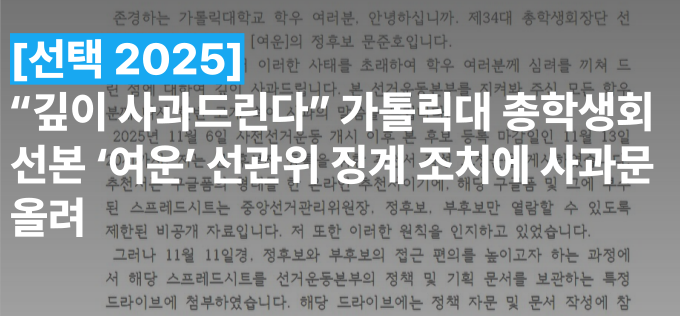 “깊이 사과드린다” 가톨릭대 총학생회 선본 ‘여운’ 선관위 징계 조치에 사과문 올려
