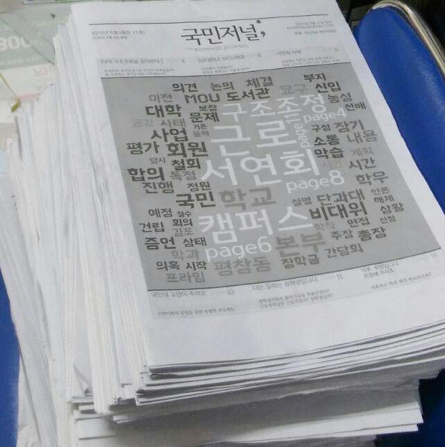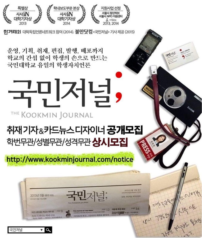 그렇게 탄생한 순수 대학독립언론 ‘국민저널’은 존재만으로 이바지했다며 대학 언론인 상까지 받는 영광을 얻었고 학기를 거듭해 학내구성원들의 인식에 반듯하게 담기는 호사를 누렸습니다.
