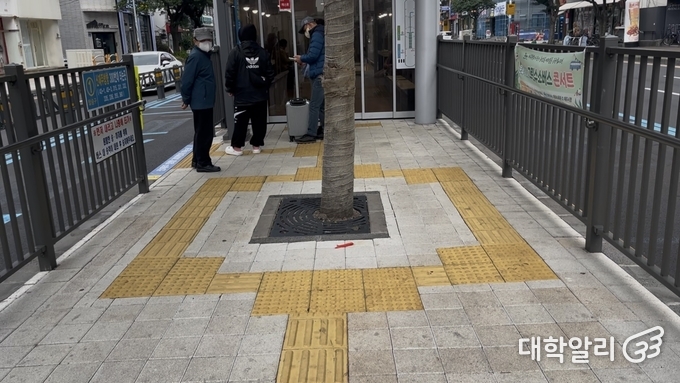섬식정류장 가운데 하나인 ‘탐라장애인종합복지관’ 정류장 앞에는 시각장애인의 보행을 돕는 점자블록을 가로막는 조경수가 설치돼 있다. 선형 점자블록(유도선)을 두 갈래로 끊어버린 이 구조물은 현장에서는 비판의 대상이 되고 있다. 장애인을 위한 시설 앞에서 장애인의 이동권을 가로막는 아이러니가 벌어진 셈이다.