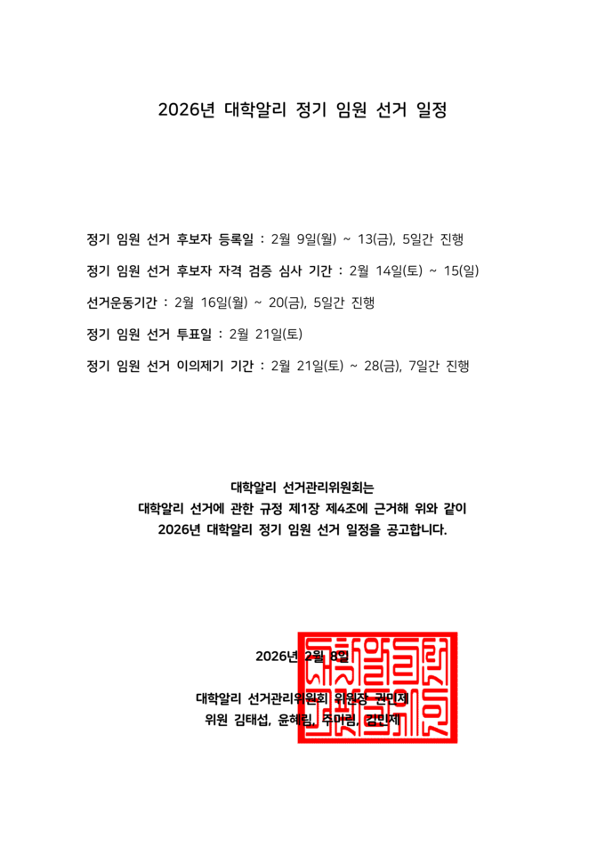 아래와 같이 2026년 대학알리 임원 선거 일정을 확정하였음을 공고합니다.