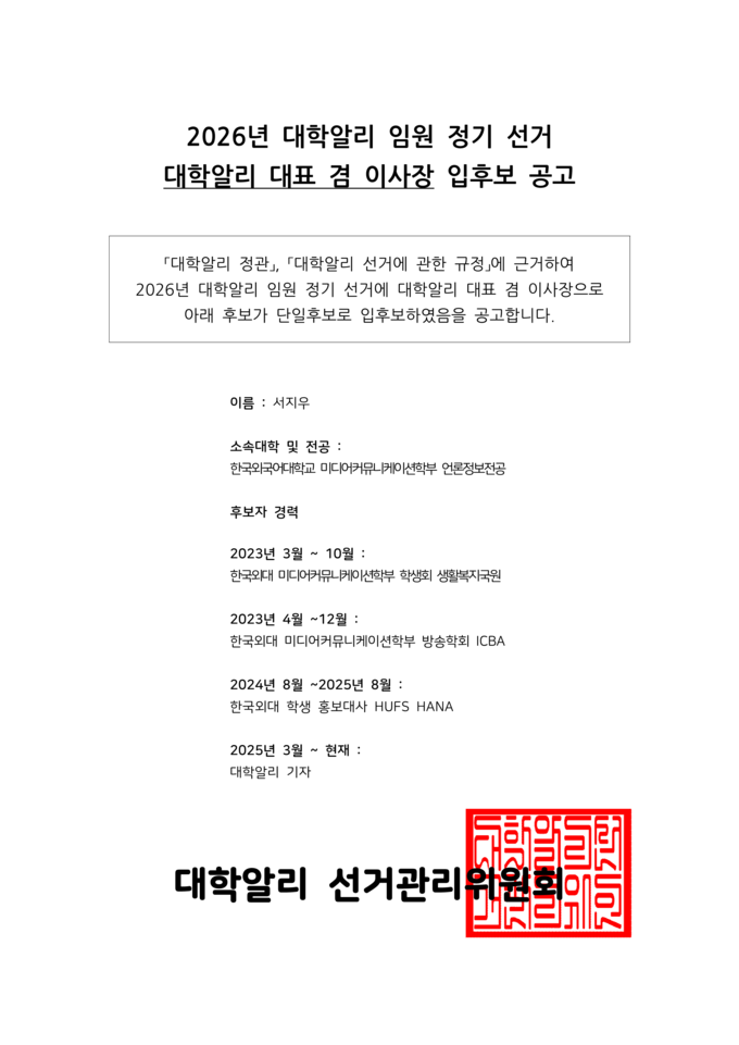 「대학알리 정관」, 「대학알리 선거에 관한 규정」에 근거하여 2026년 대학알리 정기 임원 선거에 대학알리 대표 겸 이사장으로 아래 후보가 단일후보로 입후보하였음을 공고합니다.