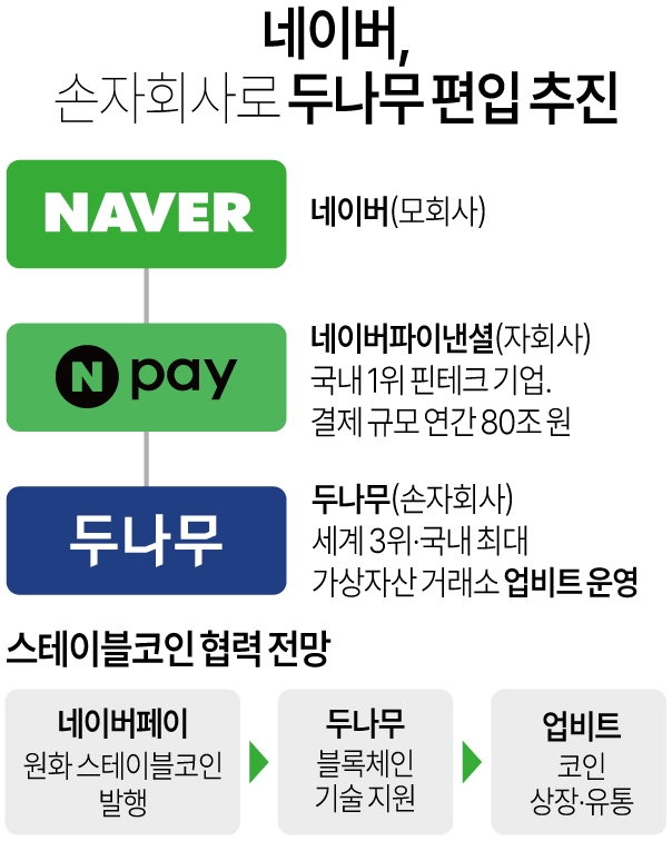 이르면 이달 말 두나무는 포괄적 주식교환을 통해 네이버파이낸셜의 100% 자회사로 편입될 전망이다. 포괄적 주식교환은 서로 다른 두 기업이 주식을 맞바꾸면서 지배구조를 단일화하는 것으로, 한 회사가 존속 지주사가 되고 다른 회사는 100% 자회사가 된다. 거래가 성사되면 초대형 디지털 금융 플랫폼이 탄생하는 셈이다. 국내외 스테이블코인 제도화 움직임 속에 이번 빅딜이 디지털 금융 지형을 바꿀지 주목된다.
