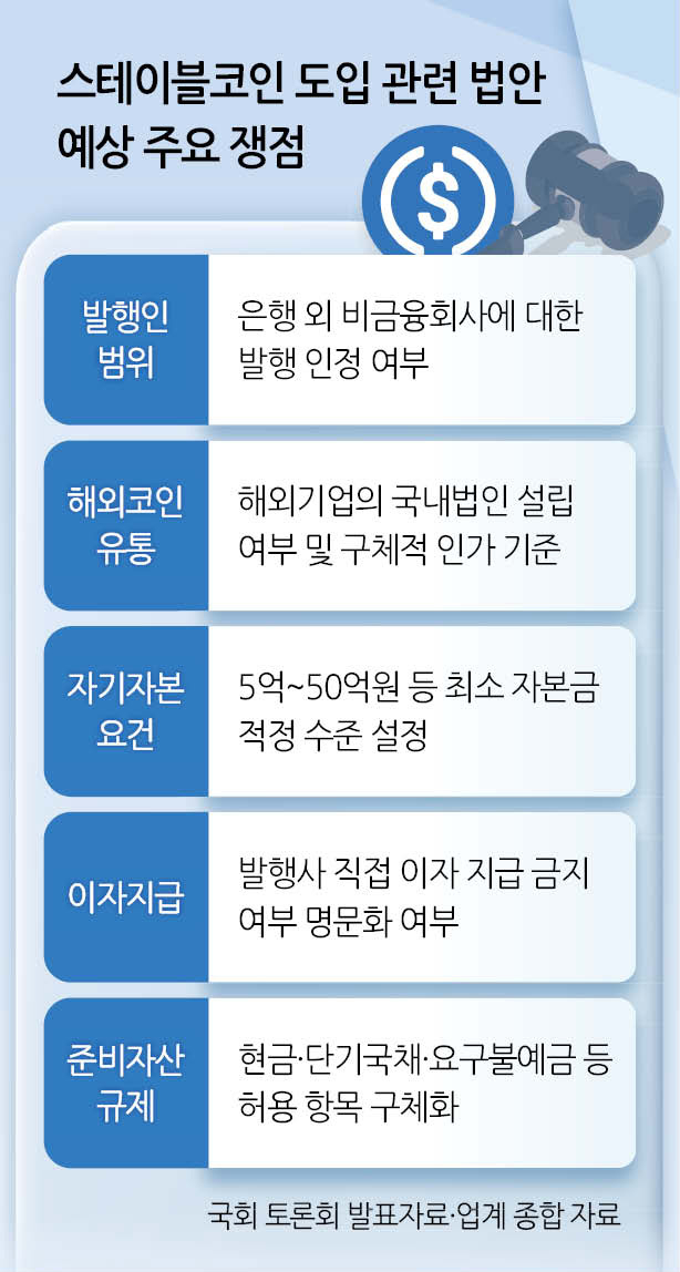 핵심 쟁점은 ‘발행 주체’다. 법안별로 발행 주체를 어떻게 규정할 것인가를 두고 입장차가 크다. 일부 법안은 은행과 같은 전통 금융기관 중심의 발행 구조를 전제로 한다. 다른 한편은 핀테크 등 비은행권까지 문호를 개방해 디지털 생태계의 속도 있는 성장을 유도하려는 방향이다. 대표적으로 민병덕 의원안은 금융위원회의 인가를 받은 자기자본 5억 원 이상 국내 법인에 스테이블코인 발행 자격을 부여하는 내용을 담고 있다.