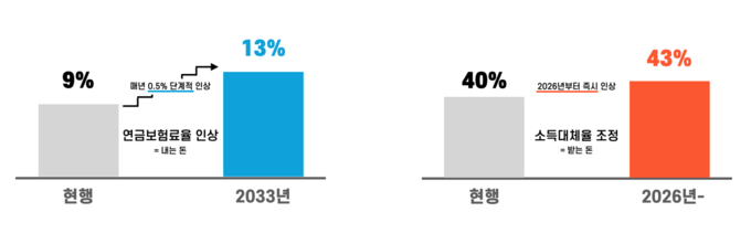 국민연금 보험료율은 2026년부터 매년 0.5%p씩 인상돼 2033년에는 현행 9%에서 13%로 올라간다. 반면 연금 수령액을 결정하는 소득대체율은 내년부터 40%에서 43%로 상향 조정된다.