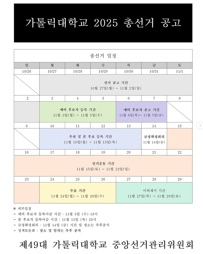 이번 총선거 일정은 △선거 공고 기간(10/27~11/2) △예비 후보자 등록 기간(11/3~5) △예비 후보자 공고 기간(11/6~7) △추천 및 본 후보자 등록 기간(11/10~13) △규정확정회의(11/14) △선거운동 기간(11/15~23) △정책토론회(장소 및 일자 추후 공지 예정) △투표 기간(11/24~26) △이의제기 기간(11/27~29)순으로 진행된다. 학과(학부) 선거 일정은 단위별 선거관리위원회에 따라 다르다.
