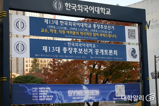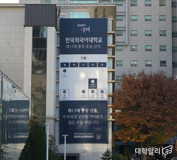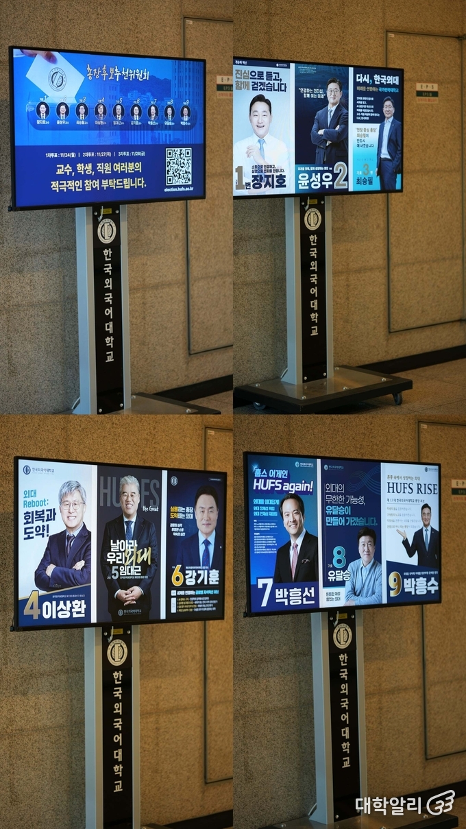 지난 16일 오후, 한국외국어대학교 서울캠퍼스 사이버관 기둥에 총장 후보들의 대형 포스터가 걸려 있는 모습이다.