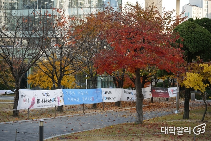 잔디광장을 따라 각 단과대 학생회가 마련한 총장후보 선거 독려 현수막이 길게 이어지고 있다. 또 인문과학관 앞에도 공개토론회와 선거 일정 등을 알리는 현수막이 걸려 있다. 캠퍼스 중심 동선 곳곳에 설치된 홍보물들은 이동 중 자연스레 눈에 띄며, 학내 구성원들에게 다가오는 총장후보 선거의 중요성을 다시금 일깨워준다.