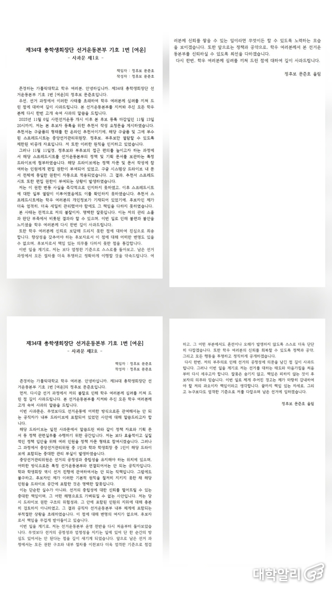 이어 “앞으로 남은 선거 과정에서 모든 권한 구조와 내부 절차를 이전보다 더욱 엄격한 기준으로 점검하겠다”며, “학우 여러분의 신뢰를 회복할 수 있도록 정책과 공약, 그리고 모든 행동을 투명하고 정직하게 공개하겠다”고 말했다.