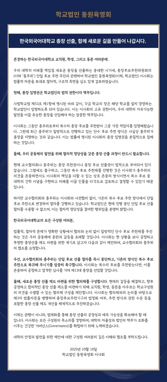 2021년 제12대 총장후보선거 이후 4년 만에 치뤄지는 제13대 총장 후보 선거는 작년부터 뜨거운 감자로 떠올랐다. 학교 법인 동원육영회의 간선제 도입 시도 때문이다.