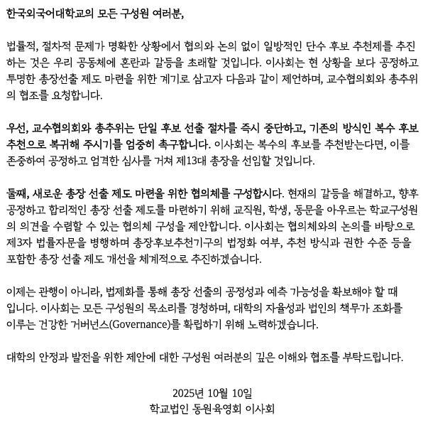 이사회의 학교 운영이 투명하게 유지되고 이사회가 제시한 학교 발전의 비전과 로드맵이 구성원의 공감을 이끌어낼 수 있다면 그들이 제시한 간선제 혹은 다수 후보자 추천이라는 제도에 대한 반발은 지금과 같지 않았을 것이다.