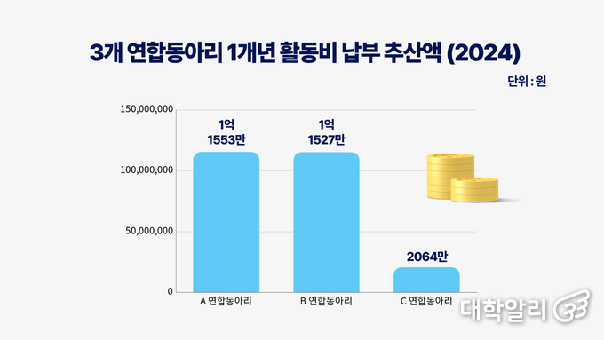 해당 내용을 토대로 계산한 결과 A 연합동아리는 지난해 약 1억1553만 원, B 연합동아리는 1억1527만 원, C 연합동아리는 2064만 원의 활동비를 누적한 것으로 보인다. 홈페이지를 통해 정확한 휴식 인원 파악이 어려워 휴식비 산출을 제외했음에도 3개 연합동아리를 합쳐 2억5000만 원이 넘는 활동비 누적액이 발생한 것으로 추산된다.