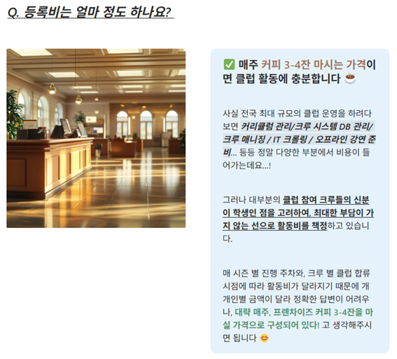 A 연합동아리 소개 홈페이지 한편에는 등록비 관련 Q&A가 있다. 그러나 해당 페이지는 '매주 프랜차이즈 커피 3~4잔 마시는 가격으로 구성되어 있다'고 명시했을 뿐, 구체적인 금액은 제시하지 않았다.