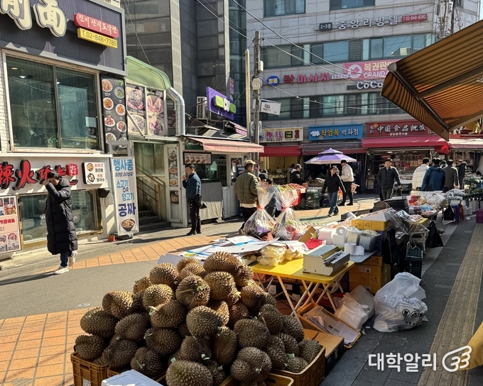 시장에 들어서니 한국의 전통 시장 풍경과는 색다른 풍경이 펼쳐졌다. 두리안 특유의 묵직하고 강렬한 냄새가 시장 입구를 메웠다. 한국의 시장에서 볼 수 없는 향신료와 약재들이 빼곡히 쌓인 매대도 보였다. 더 들어서자, 찜기에서 피어오르는 하얀 김 사이로 익어가는 꽃빵, 진열대마다 쌓인 월병과 푸주 등 중국 명절 음식들이 보였다. 가격표에는 한글과 중국어가 나란히 병기돼 있었다.