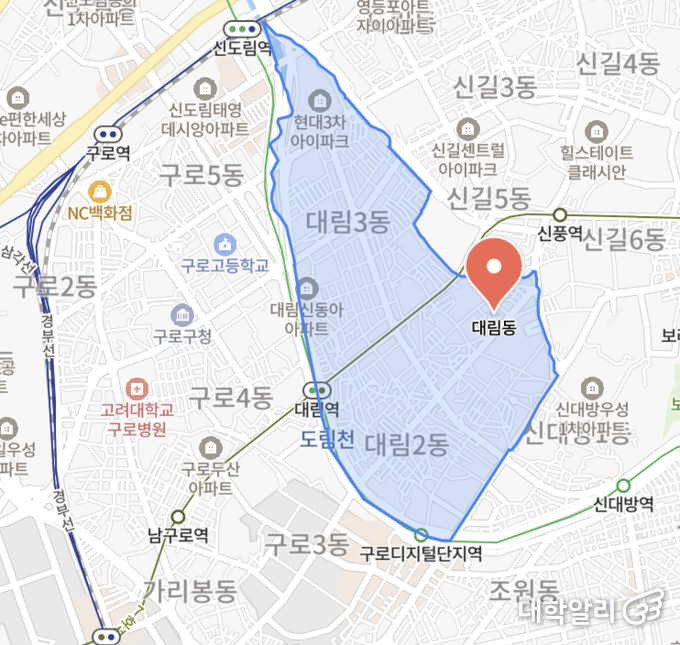 대림동은 신대방동과 신도림동 사이에 자리한 동네다. 1949년 두 지역이 서울시로 편입되면서 신대방동의 '대(大)'와 신도림동의 '림(林)'을 합쳐 이름이 지어졌다. 지명 자체에 두 지역의 경계에 있다는 뜻이 새겨져 있는 셈이다.