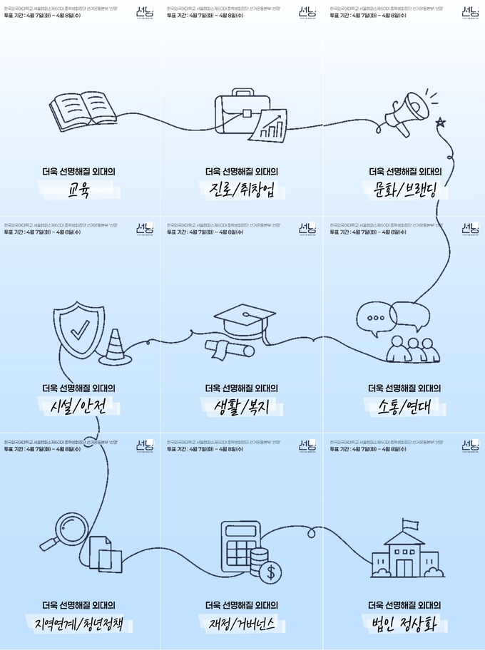 한국외국어대학교 서울캠퍼스 제60대 총학생회장단 선거운동본부 ‘선명(이하 선명)’의 공약이 발표됐다. 선명은 시설·안전, 생활·복지, 소통·연대, 문화·브랜딩, 진로·취창업, 교육, 지역연계·청년정책, 재정·거버넌스, 법인 정상화 등 9개 분야 공약을 내걸었다. 공약집을 보면 학사제도 개선과 장학 확대, 학식 정상화, 캠퍼스 공간 정비 같은 생활밀착형 공약이 두드러진다.